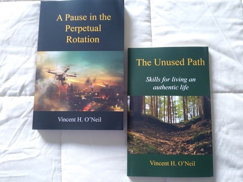 The first book, A Pause in the Perpetual Rotation, is a science fiction novel depicting a future United States where everyone has everything they need--except a purpose. A new philosophy called The Unused Path has been embraced by many, and the government finds this increasingly disturbing.
